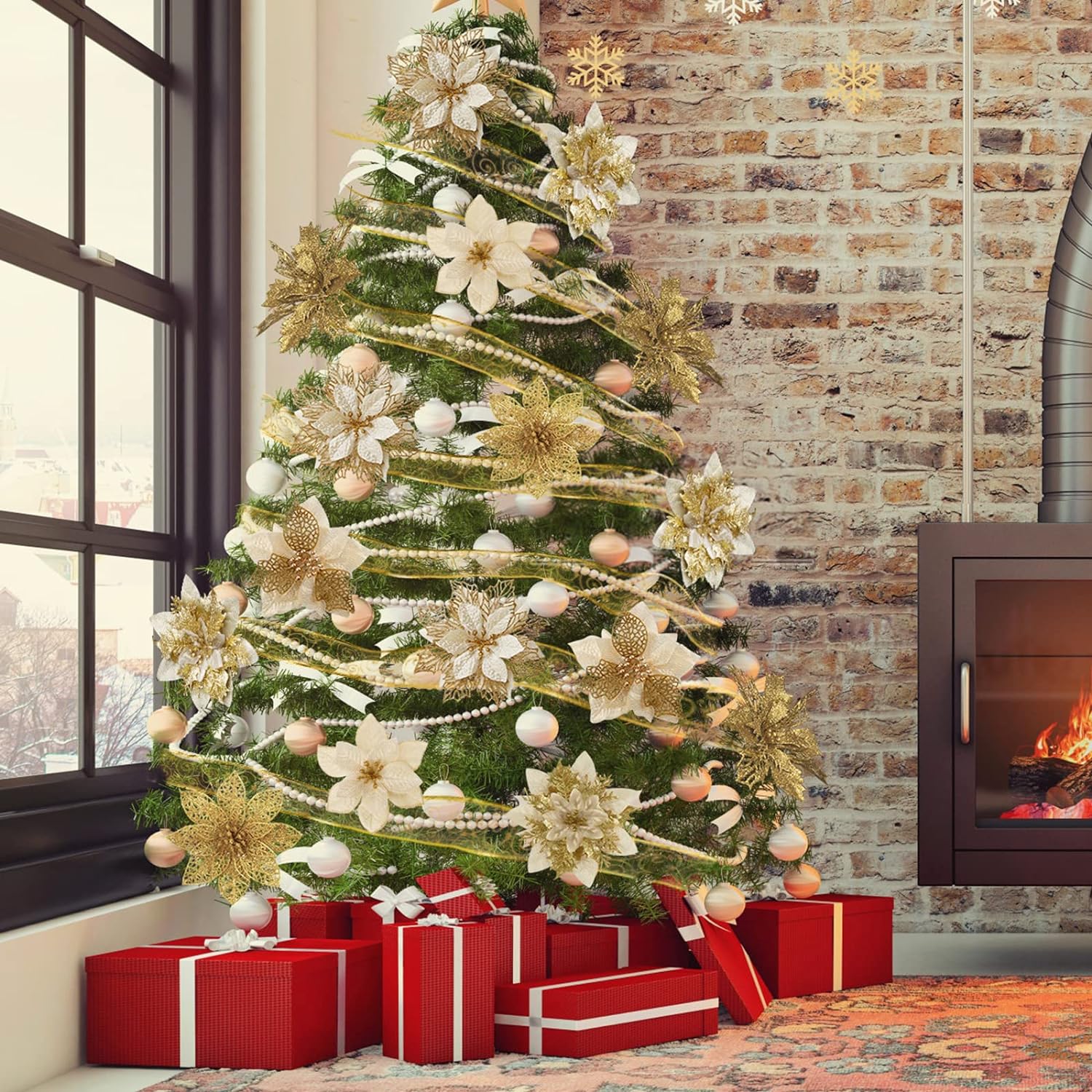 26 Pcs Gold Christmas Decorations Set, 6 Style Poinsettias Artificial Christmas Flowers with 16 Yards Christmas Tree Ribbon Ornaments for Winter Holiday DIY Crafts Indoor Outdoor Home Decor