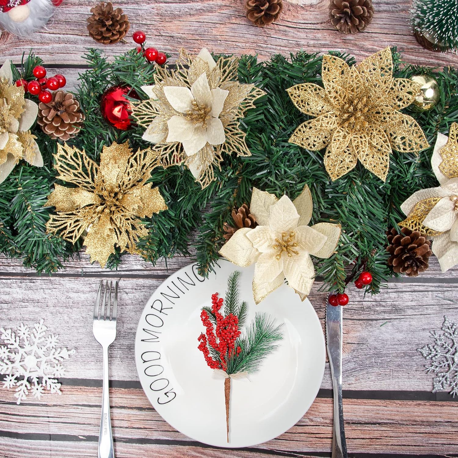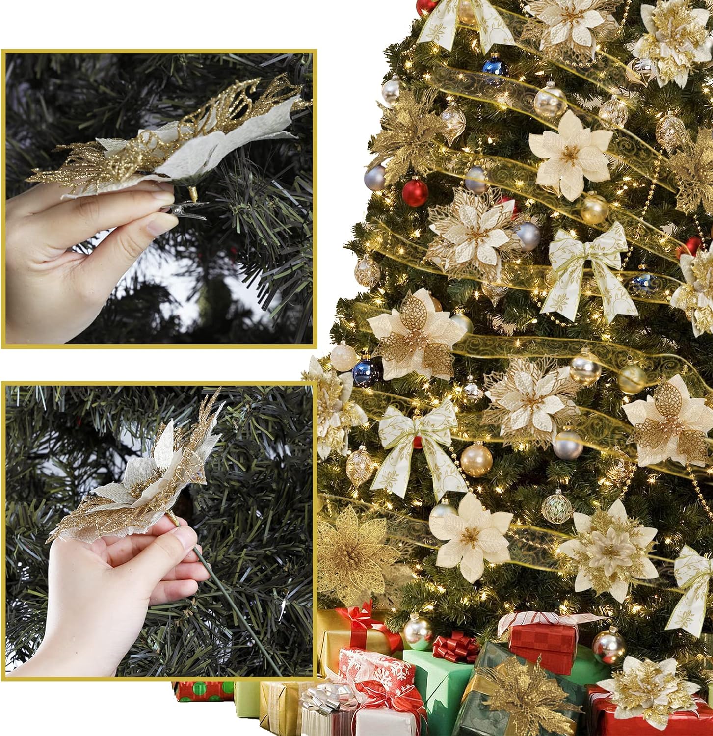 26 Pcs Gold Christmas Decorations Set, 6 Style Poinsettias Artificial Christmas Flowers with 16 Yards Christmas Tree Ribbon Ornaments for Winter Holiday DIY Crafts Indoor Outdoor Home Decor quantity