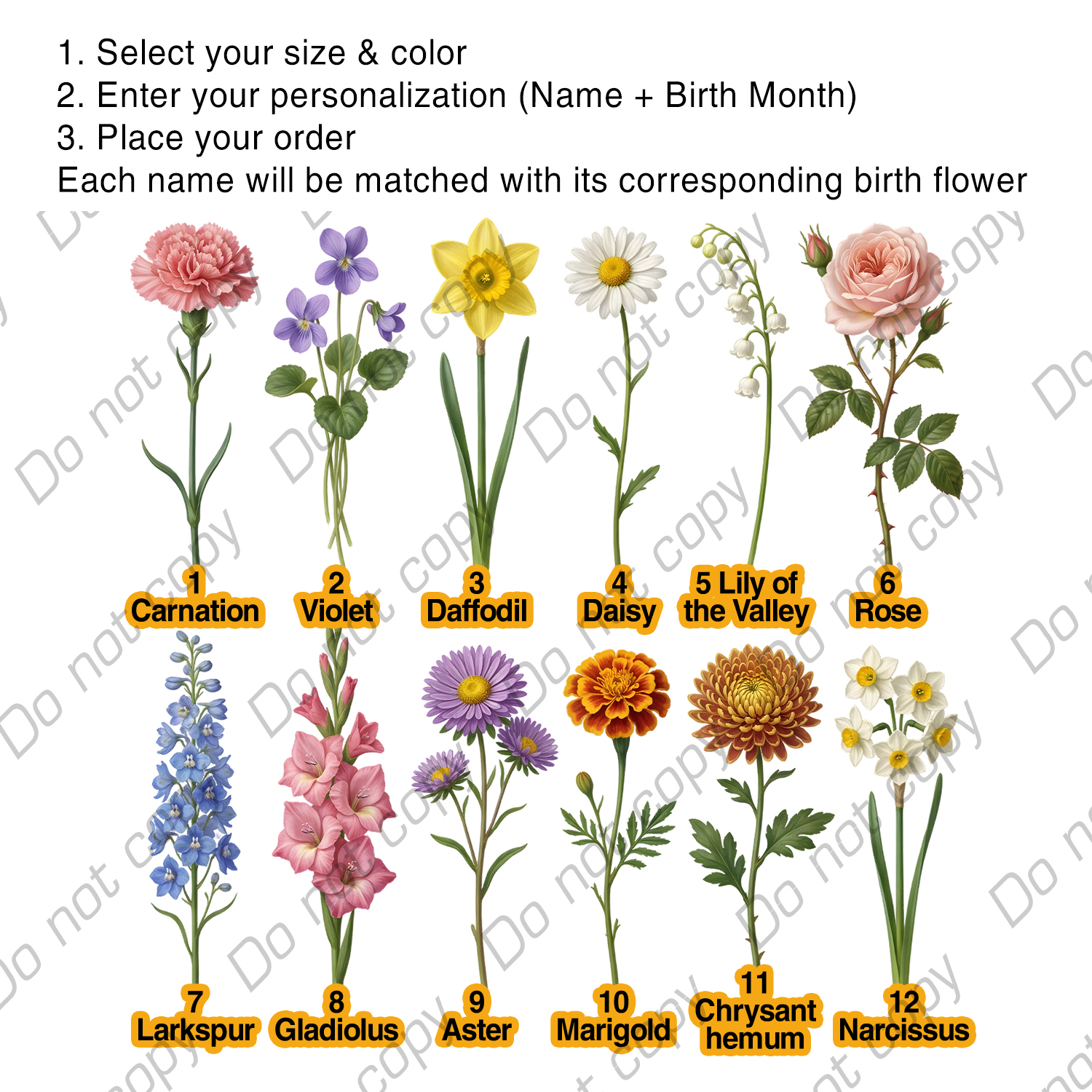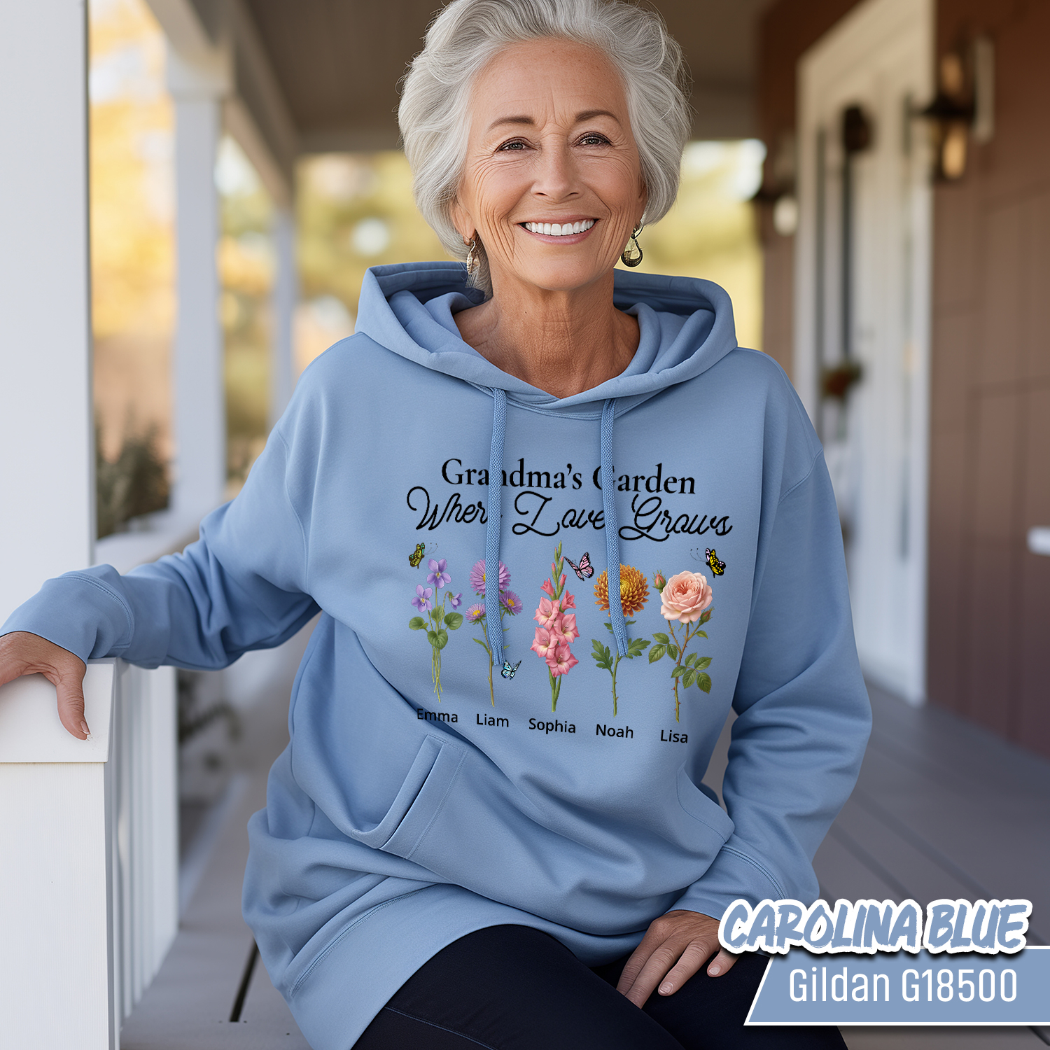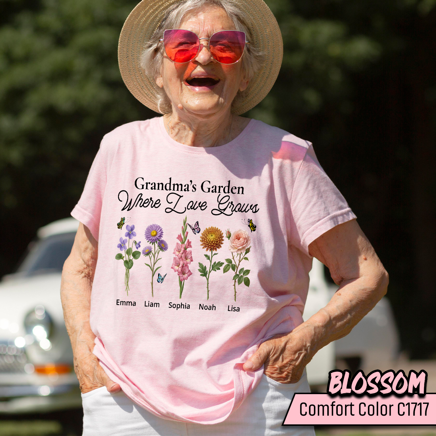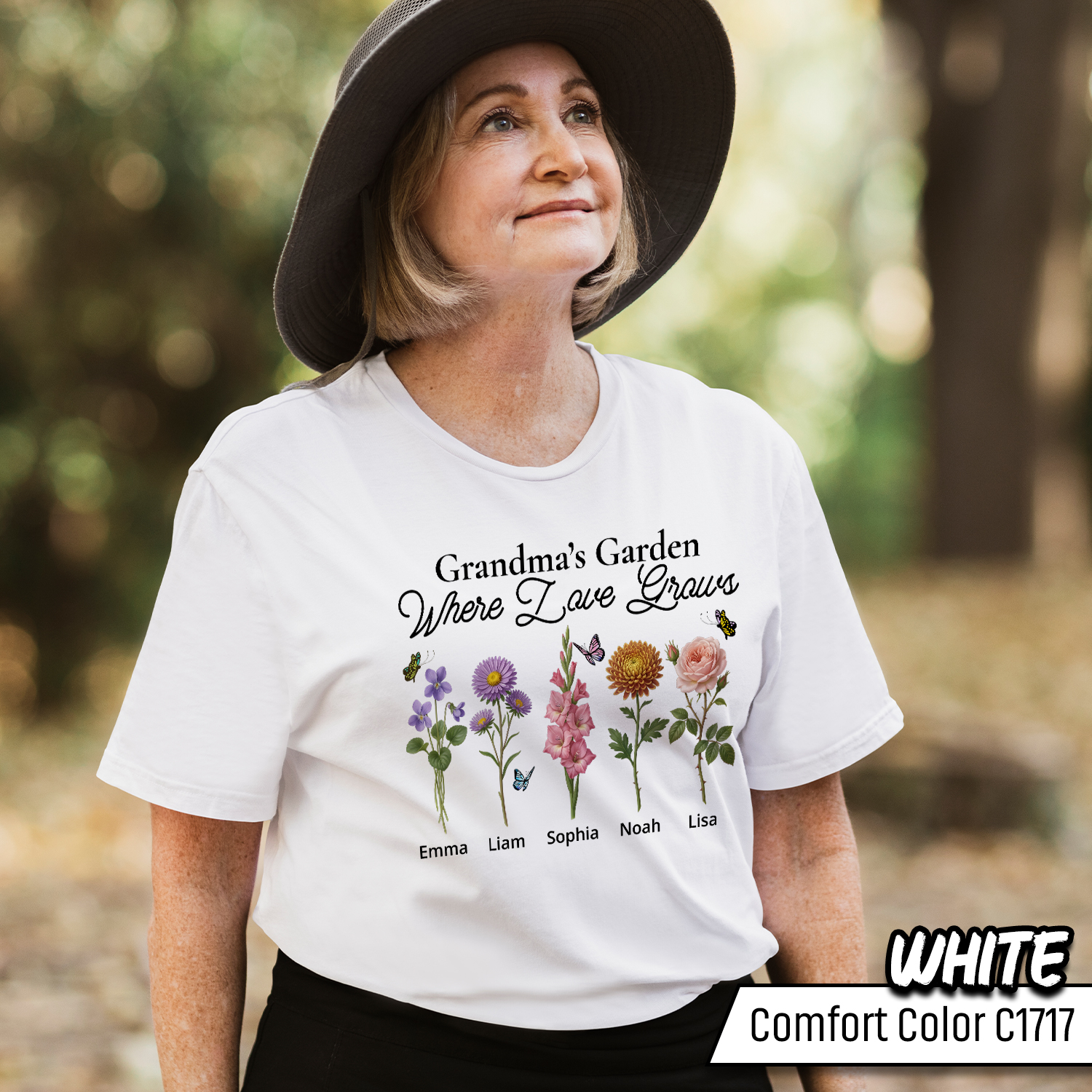 Celebrate the love of a grandmother with a personalized floral shirt featuring each grandchild as a beautiful birth flower. A meaningful keepsake she’ll cherish forever.