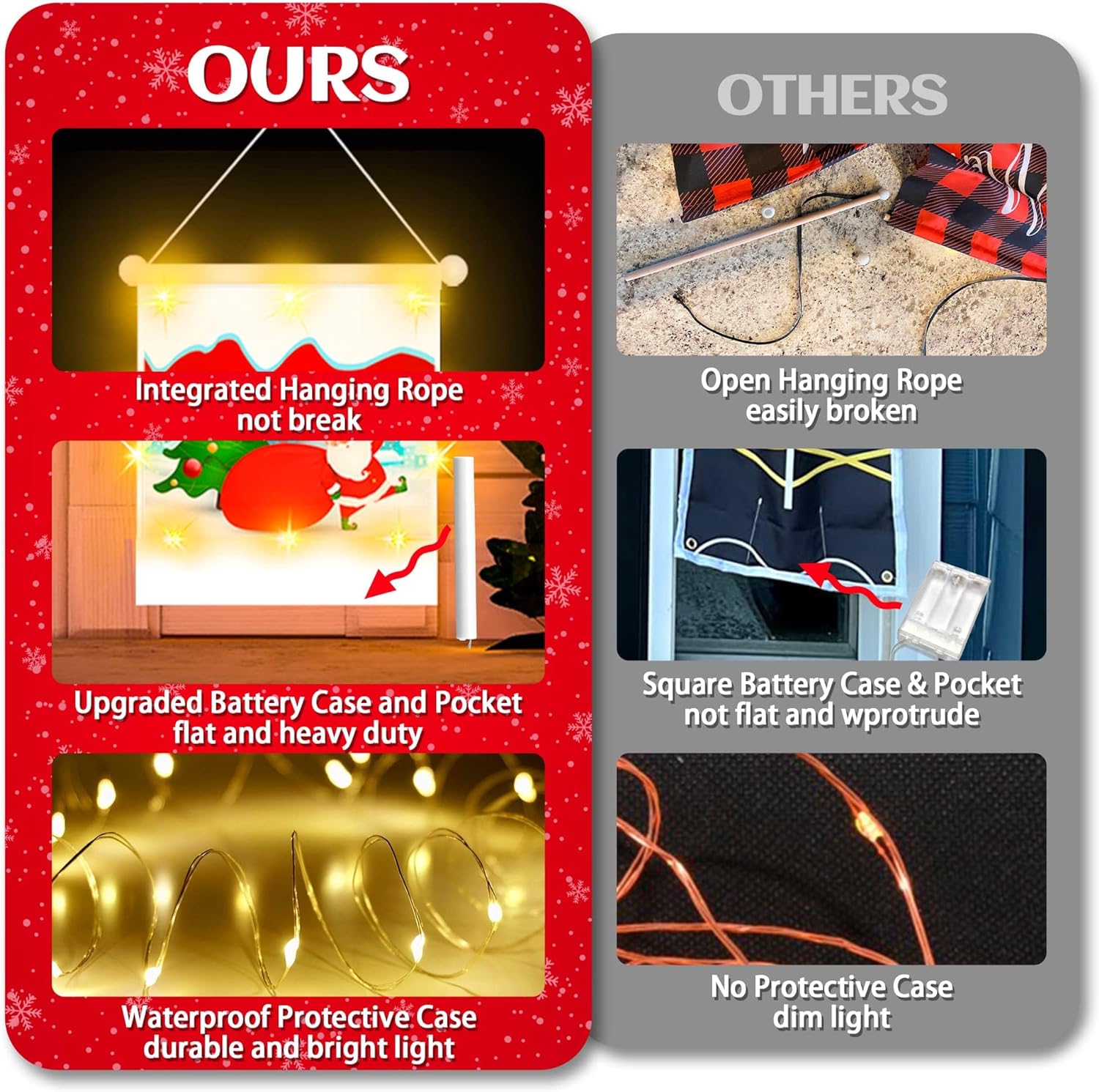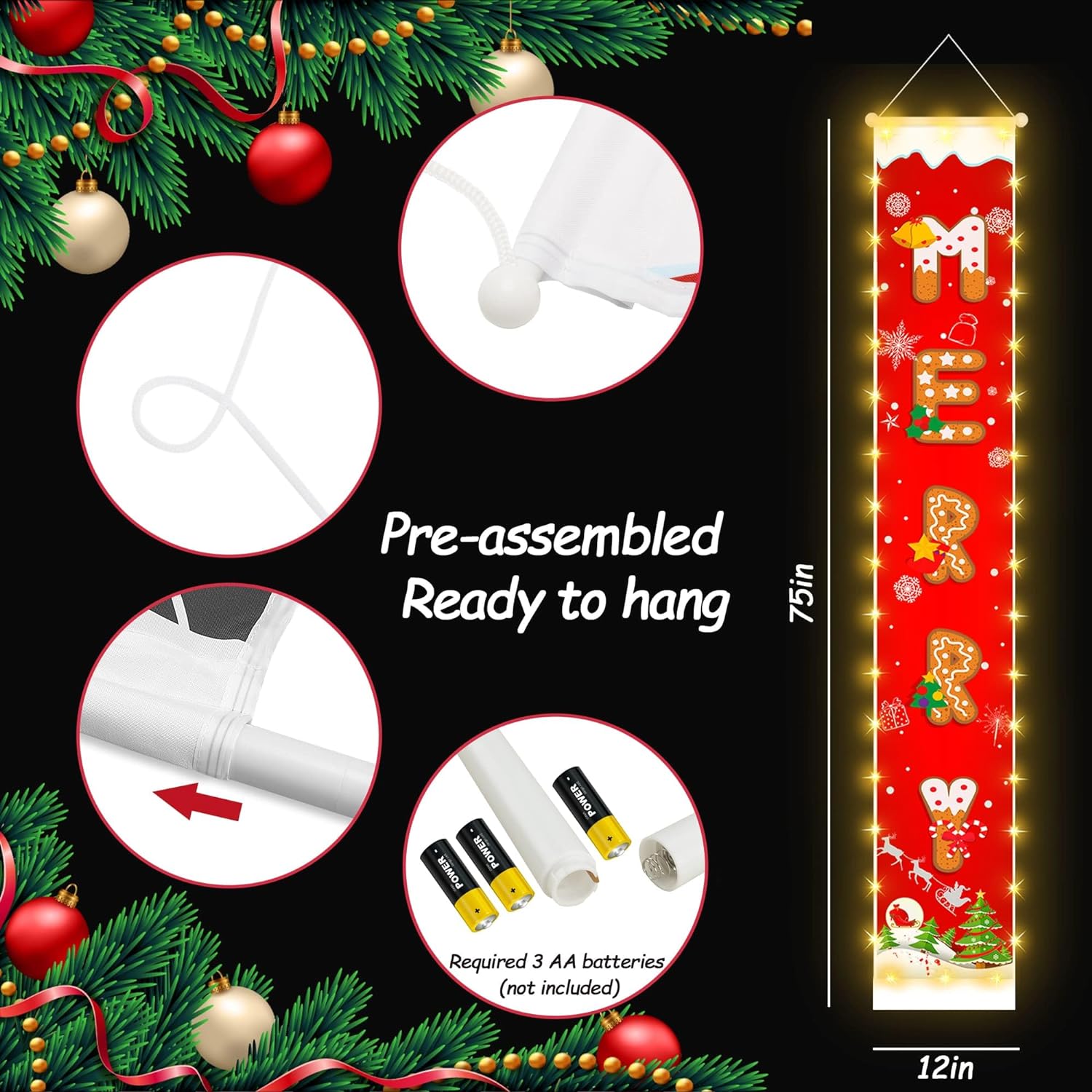 Christmas Decorations Banners with String Lights, Cookie Pattern Merry Christmas Party Decor, Bright Red Xmas Hanging Banner for Outdoor/Indoor Home Front, 600D Fabric Porch Sign