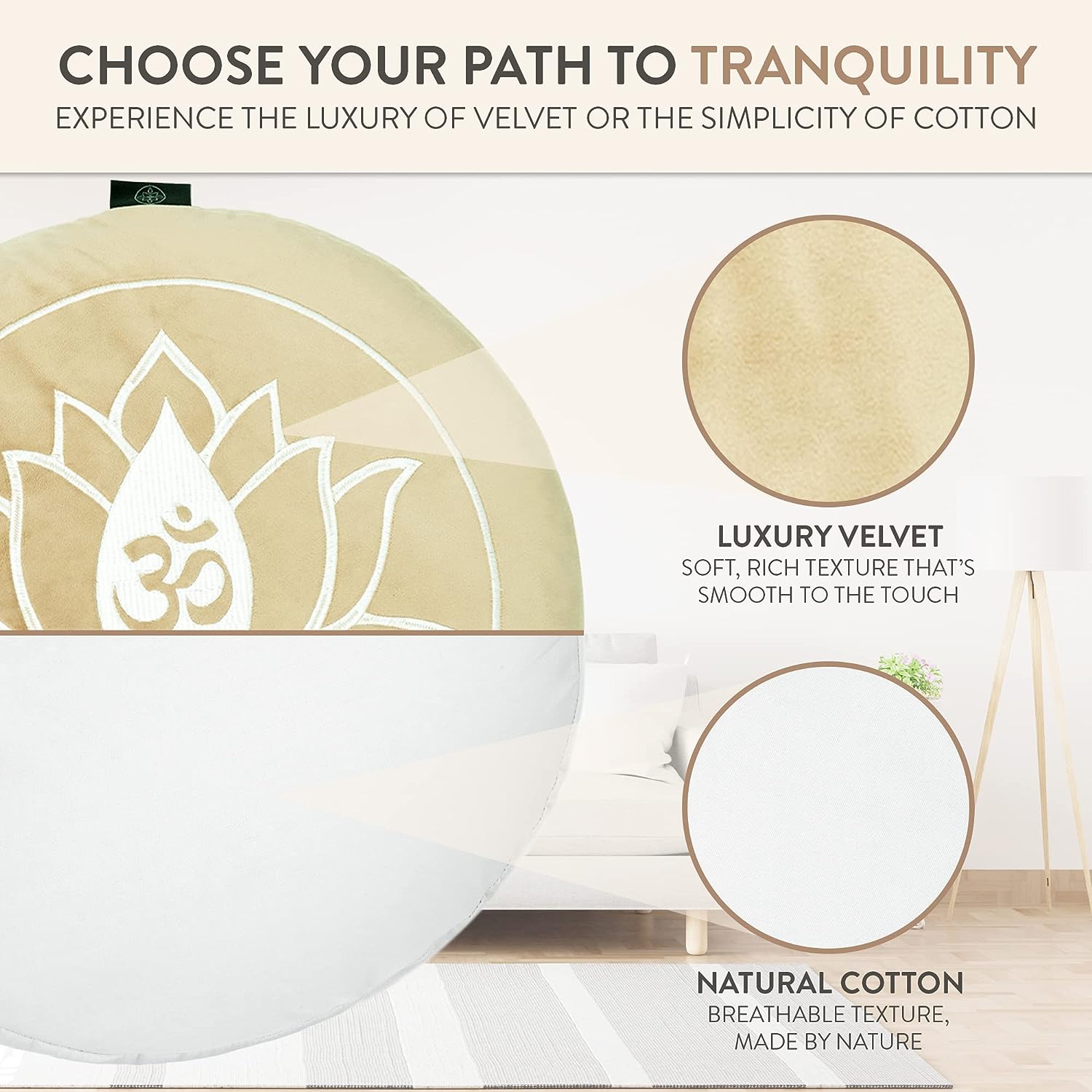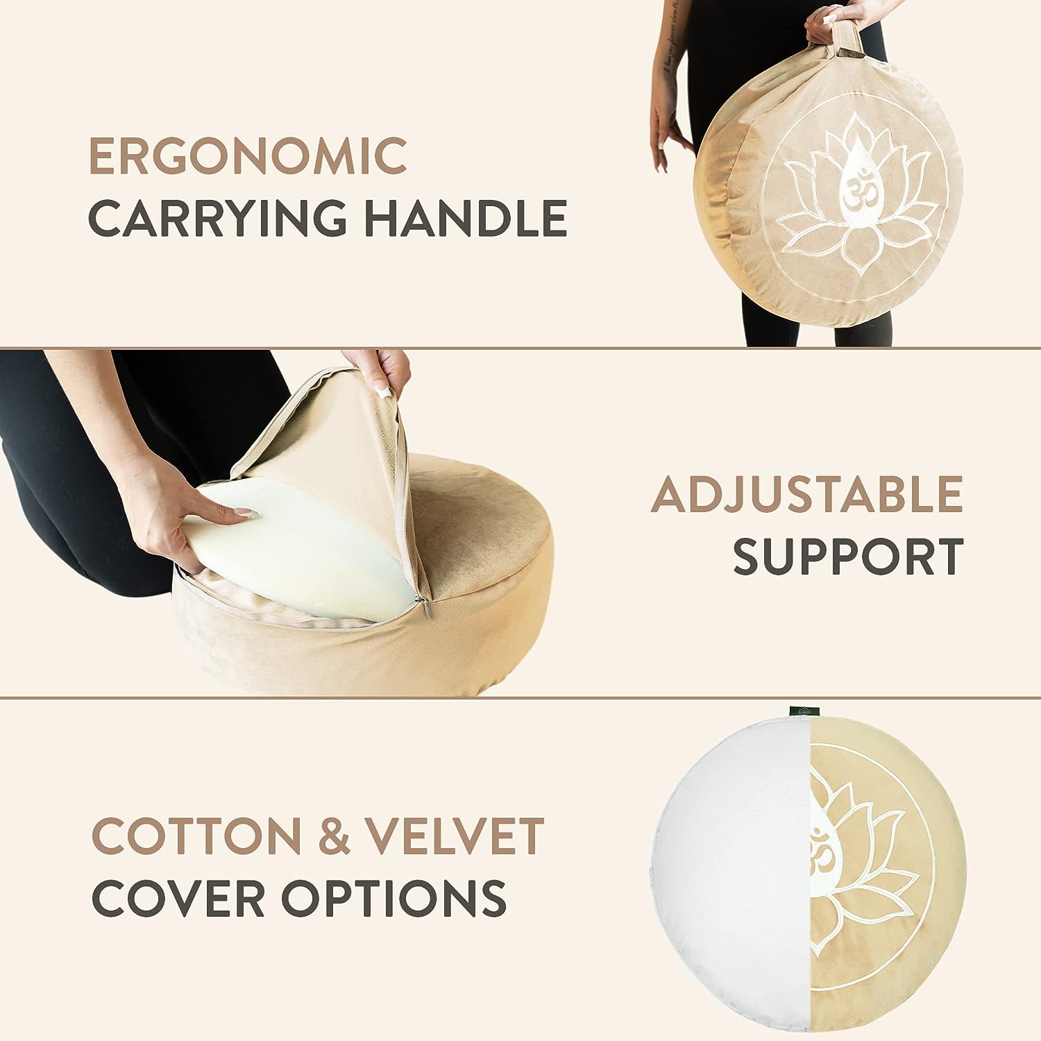 Meditation Cushion - Comfortable Zafu Meditation Pillow - Soft Velvet Meditation Seat Cover + Cotton Cover Option - Yoga Pillow for Floor Seating w/Carry Handle, Floor Pillow, Beige