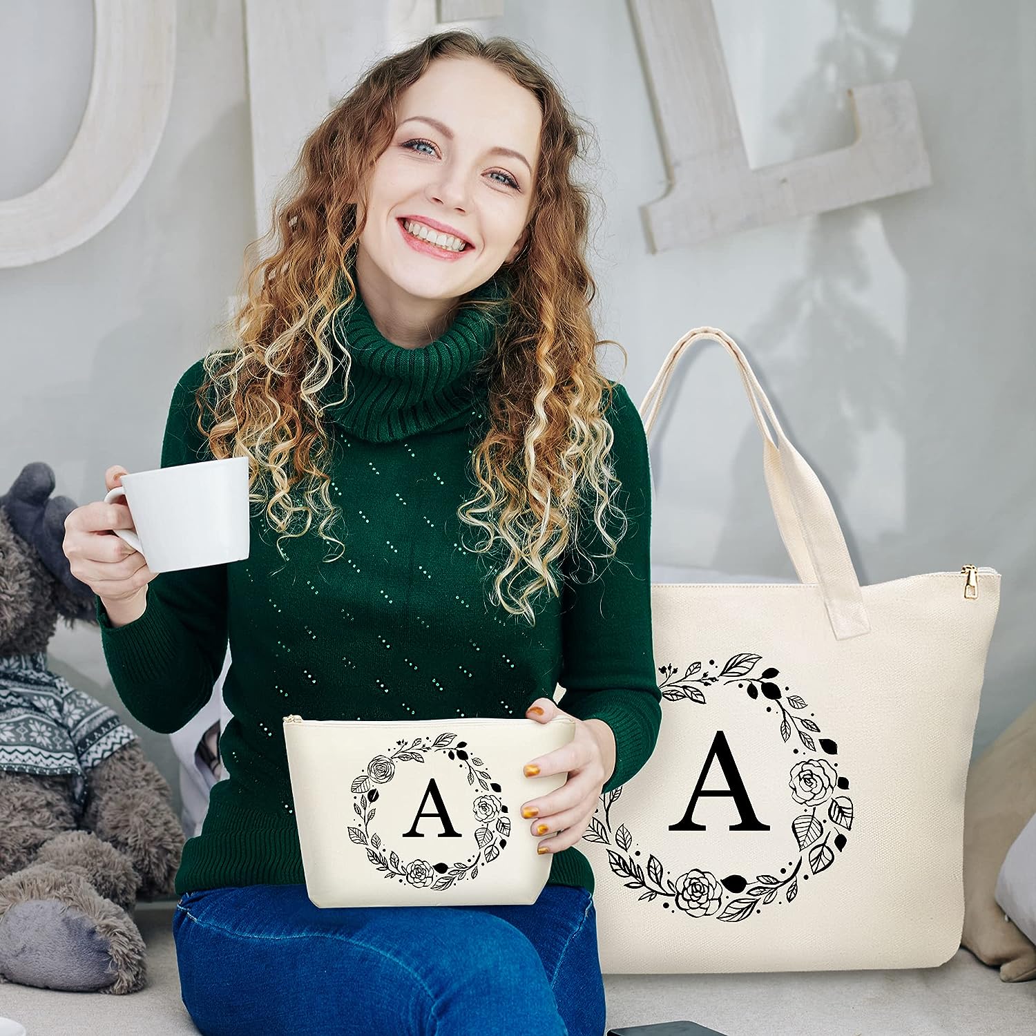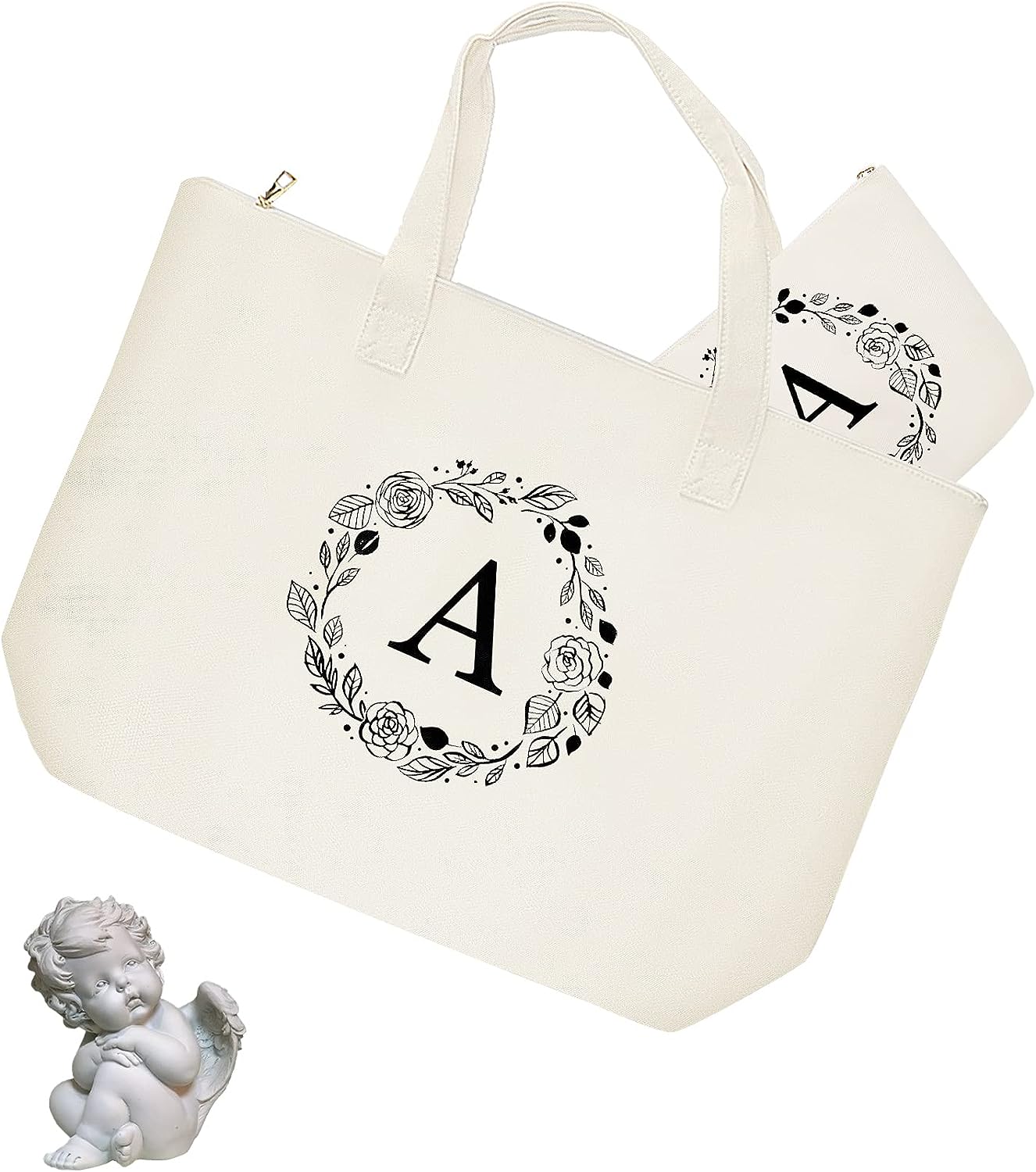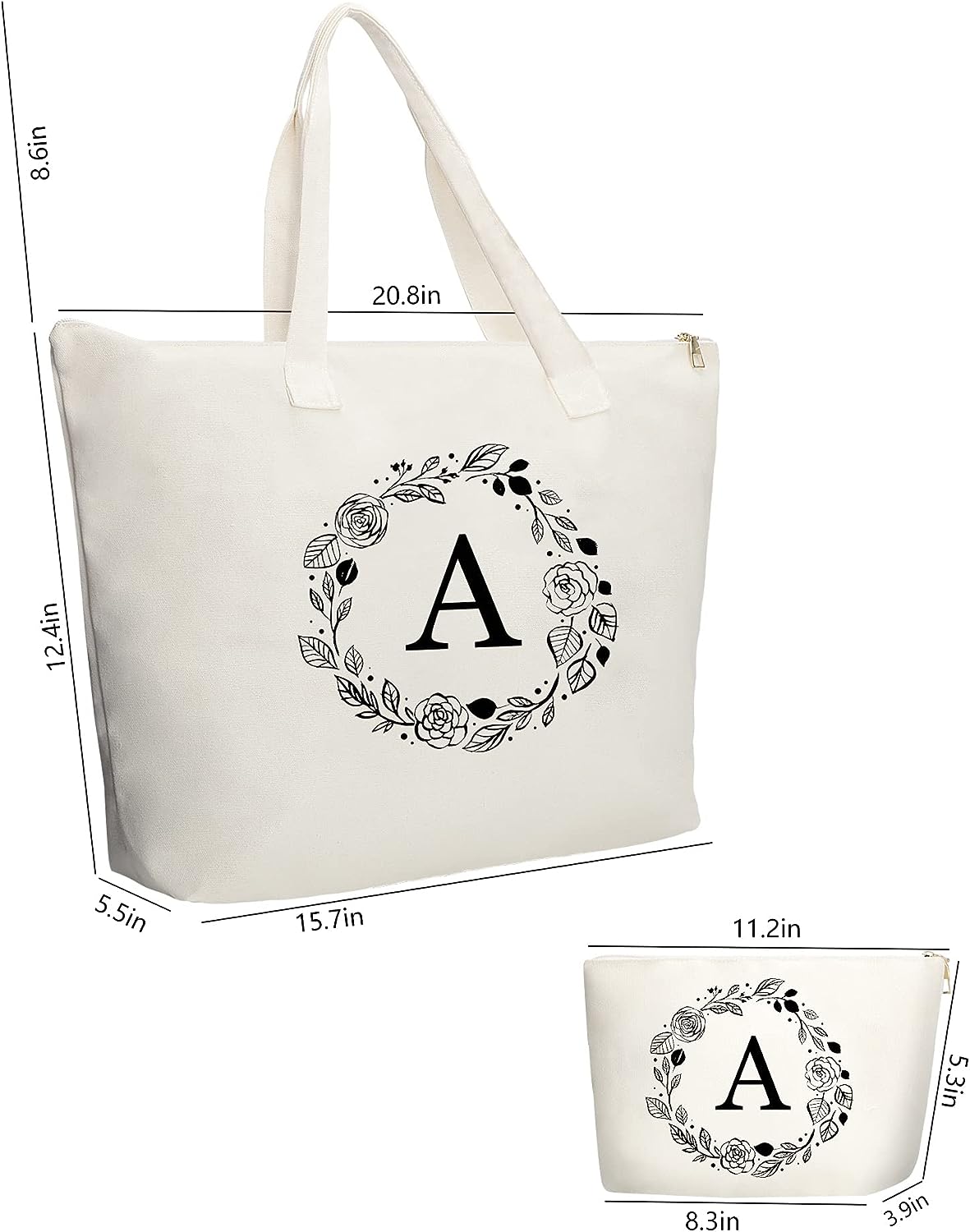 Personalized Initial Canvas Tote Bag with Zipper, Present Bag with Inner Pocket & Make Up Bag, Great Gifts for Women, Mom, Teachers, Friends, Bridesmaids