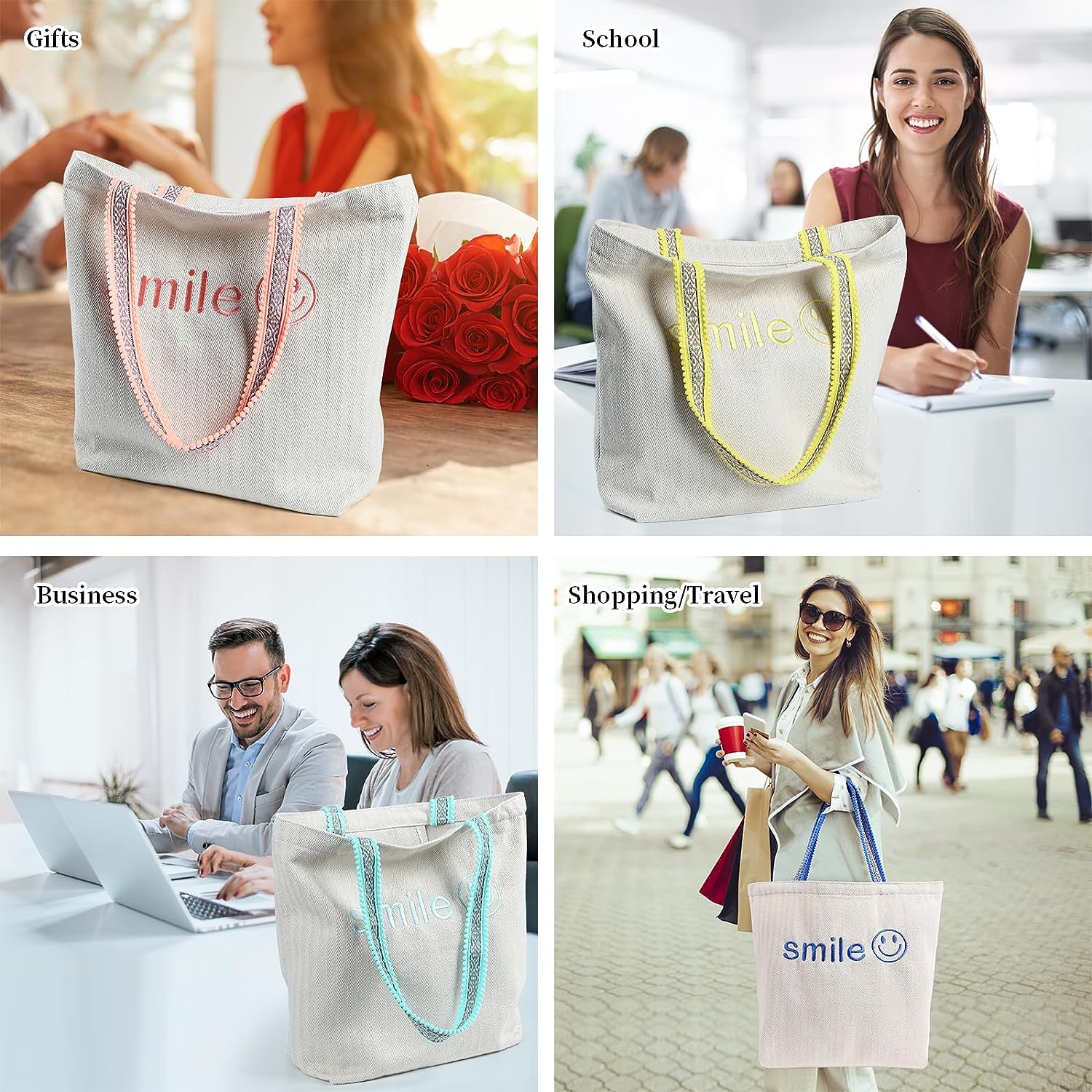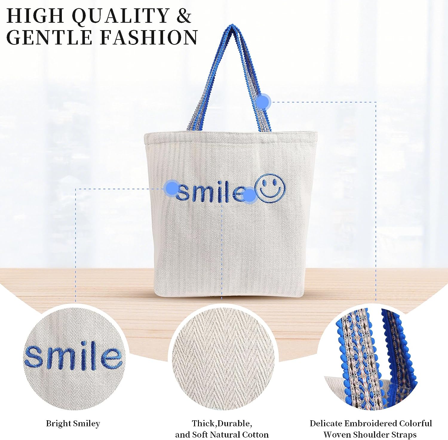 “❤ Welcome to the store ❤ STYLISH TEMPERSMENT CANVAS BAGS !Have a different good mood with you every day! Thick and soft natural cotton canvas bag, delicate embroidered colorful woven shoulder straps have a sweet atmosphere, suitable for matching various clothing styles and seasons. Make your temperament gentle and slightly sweet, cute and stylish. Product details: Large Capacity Design large capacity bag and inner patch pocket can hold a lot of your personal belongings. Whether you ‘re going out to work, school, picnic, or on a leisurely trip,let you have a relaxing and enjoyable time. Multifunctional Mood Bags High-quality color woven shoulder straps are the secret to a good mood every day.Orange-pink represents new hope,lovely, soft. Green is the color of nature, representing freshness,comfort, and hope. Yellow has the light of the sun, warm, rich. Blue represents tranquility ,freedom, generosity and far-reaching.Let every day has a different good mood to accompany you. Ideal for Personalized Gifts The gentle, sweet and stylish tote canvas bags are the gift of choice.Each bag comes with a gift card to send your best wishes along with the bag. Let her feel your love and warm care in her daily life and become the most fashionable and sweet woman or girl. Exquisite Packaging We have prepared thick non-woven bags for you, so that your canvas bag is more impeccably cared for and always in perfect condition directly to your hands. What’s the store difference? ♥ Higher quality ♥ More favorable price ♥ More satisfactory after-sales service Exquisite Packaging The store warm tips for you ♥ We have prepared thick non-woven bags for you, so that your canvas bag is more impeccably cared for and always in perfect condition directly to your hands. Manual measurement of the factors, the size may have 1-2 cm deviation.If you are not satisfied with your purchase, please feel free to contact us. grains”