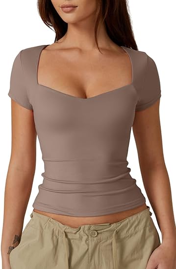 Slim Fit Basic Tee with Sweetheart Neckline and Short Sleeves, a Stylish Crop Top for Women