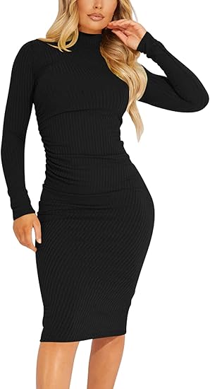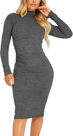 This basic ruched dress is made from a highly stretchy, super soft, solid-colored fabric that is lightweight and breathable. The sexy bodycon design features a flattering ruched waist, ribbed knit cotton material, high neck, long sleeves, knee-length cut, and a chic, elegant, body-hugging fit that’s easy to style. Ideal for casual outings, daily wear, the office, vacations, or nights out, it pairs perfectly with high heels or sneakers for a feminine and stylish look. Available in sizes S to XXL, it’s great for spring, fall, and winter. Care instructions: hand or machine wash; do not bleach.